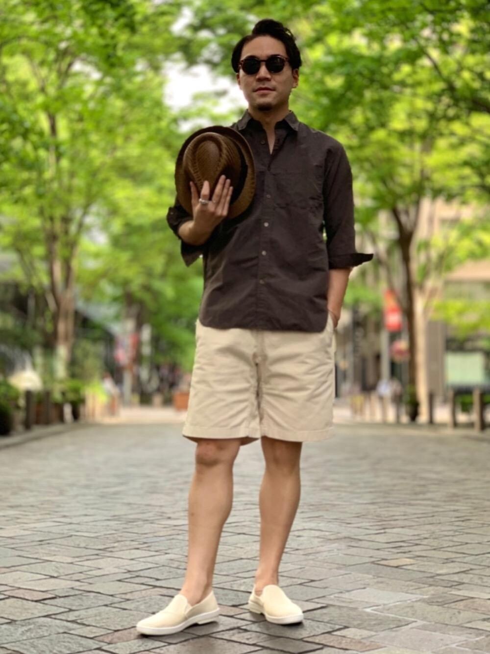 《身長172cm》着用size:shirt S/pants M/shoes 41 リネン混のシャツをメインにしたスタイリングです。夏らしくショートパンツで。