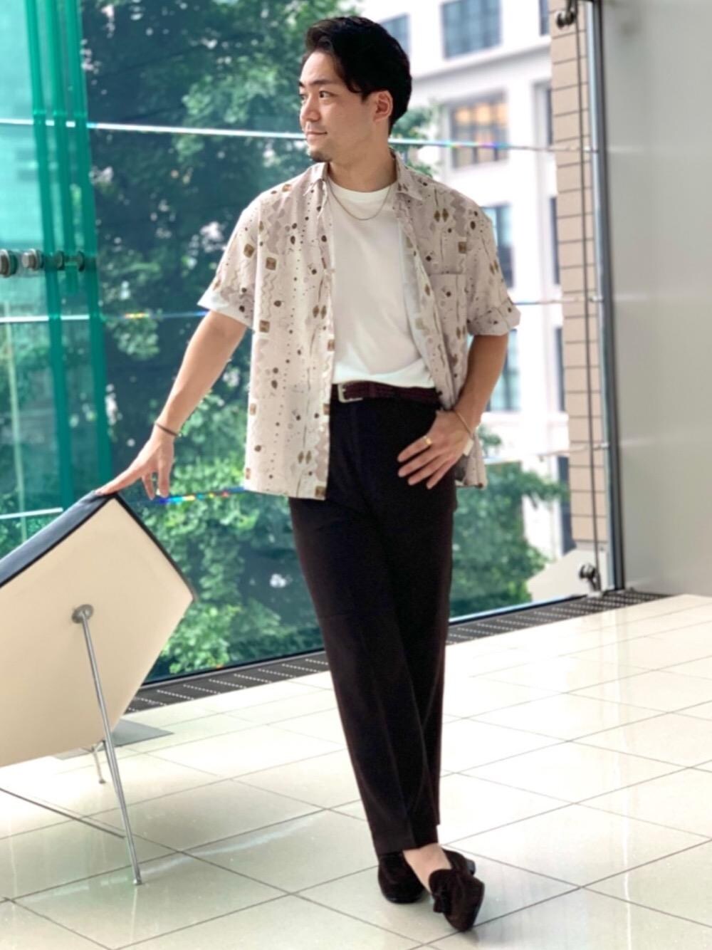 《身長172cm》 カジュアルなシャツにクリース入りのパンツ、革靴を合わせて上品な仕上がりに。アクセサリーはゴールドで統一しました。