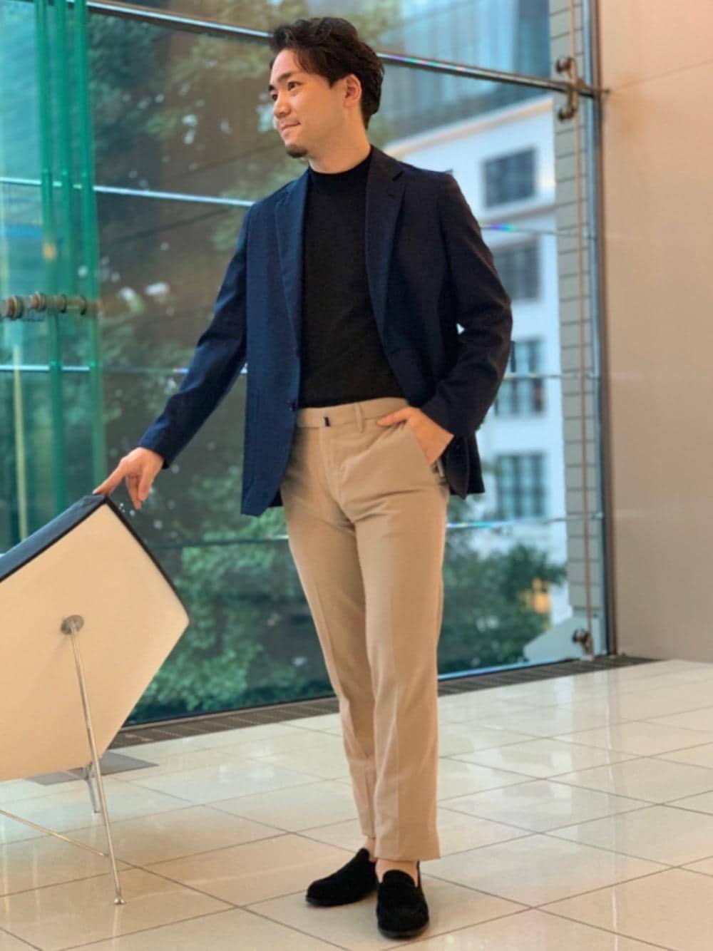 《身長172cm》 ネイビー×ベージュ合わせの定番ジャケパンスタイル。足元にフレンチローファーを合わせてトラッドなフレンチスタイルに。