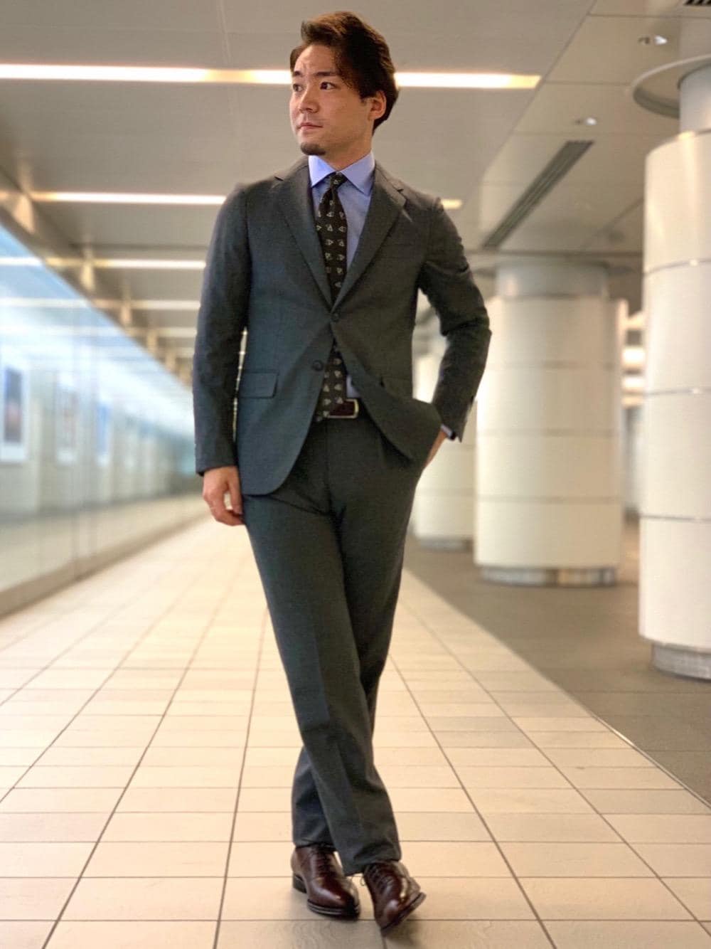 《身長172cm》 グレーのスーツにサックスブルーのシャツとブラウンのタイを挿しクラシックな雰囲気に。