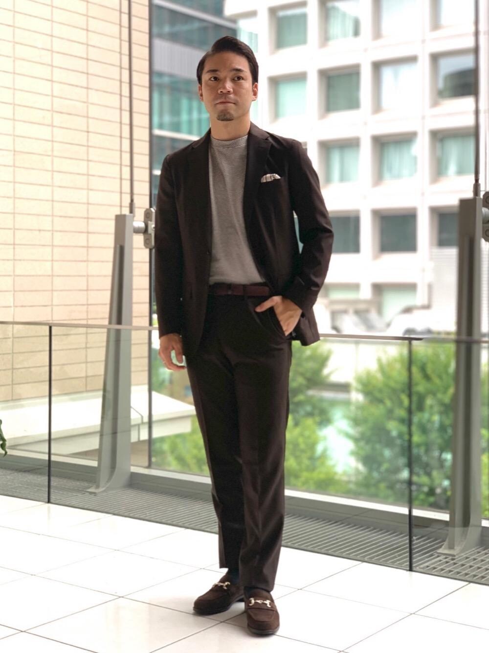 年齢:20代後半 身長:172cm 普段サイズ:アウター、トップス S、M/ボトムス M/革靴 25.5cm スニーカー 26.5cm 【サイズ感】 ジャケット:標準的 パンツ:標準的 シューズ:標準的 【コーディネート】 ブラウンを基調としたスタイリング。スエードの革靴を取り入れて落ち着いた印象に。シャツではなくカットソーで合わせてカジュアルなスーツスタイルに仕上げました。