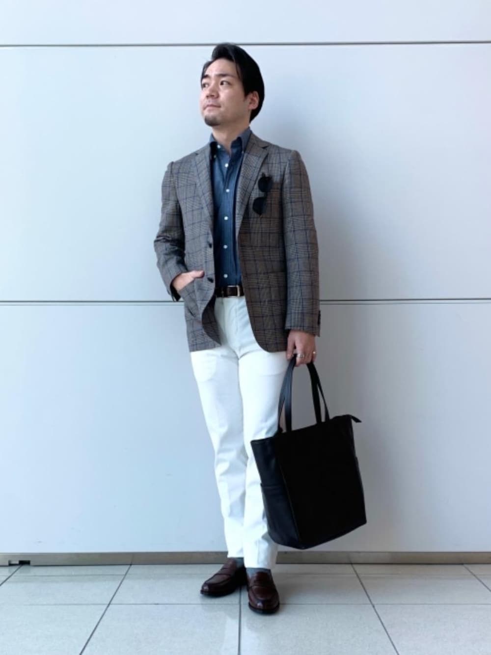 年齢:20代後半 身長:172cm 体重:67kg 普段サイズ:アウター、トップス S、M/ボトムス M/革靴 25.5cm スニーカー 26.5cm 《サイズ感》 ジャケット:標準的 パンツ:標準的 シャツ:ややゆったり シューズ:標準的 《ポイント》 大胆なチェックのジャケットをメインとしたスタイリング。柄を引き出せるため、他のアイテムは引き算でシンプルに。柄の色を拾ってブルーデニムでも○です。