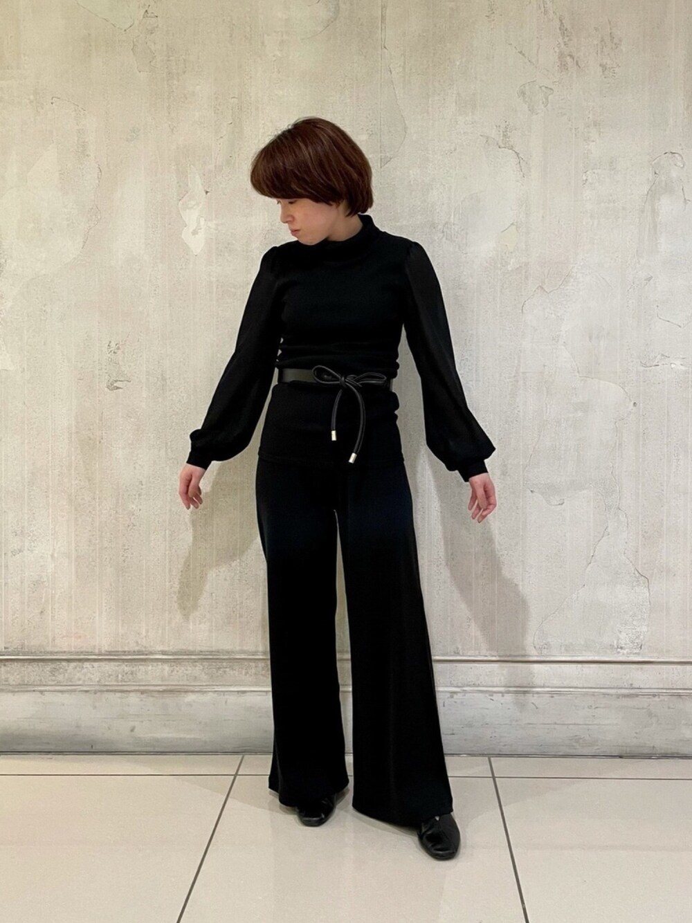 トップス30-11-31-901 1サイズ 19カラー パンツ30-11-09-902 1サイズ 19カラー ベルト37-02-61-006 1サイズ 19カラー ブラックコーデで合わせてみました。袖は、透け感のある素材で、全身ブラックであわせても軽さが出ます。