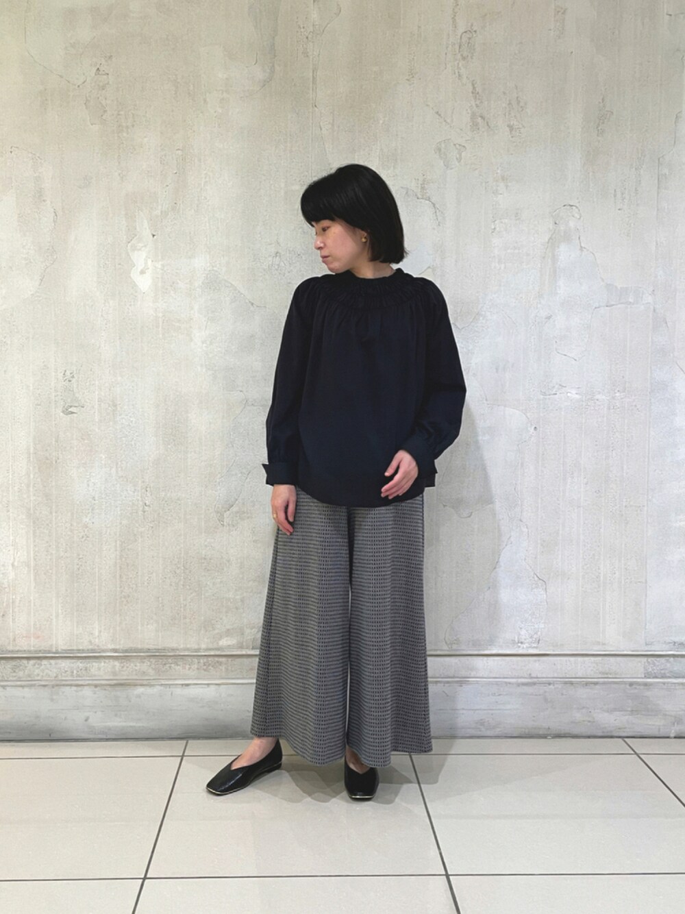ブラウス10-12-01-020 1サイズ ブラック パンツ30-12-09-609 1サイズ グレー コットンレーヨンの素材感で薄手なので秋口からすぐに着ていただけるブラウスです。シンプルながらも首元のギャザーがポイントになっております。リラックス感のあるパンツと合わせたコーディネートもおすすめです。