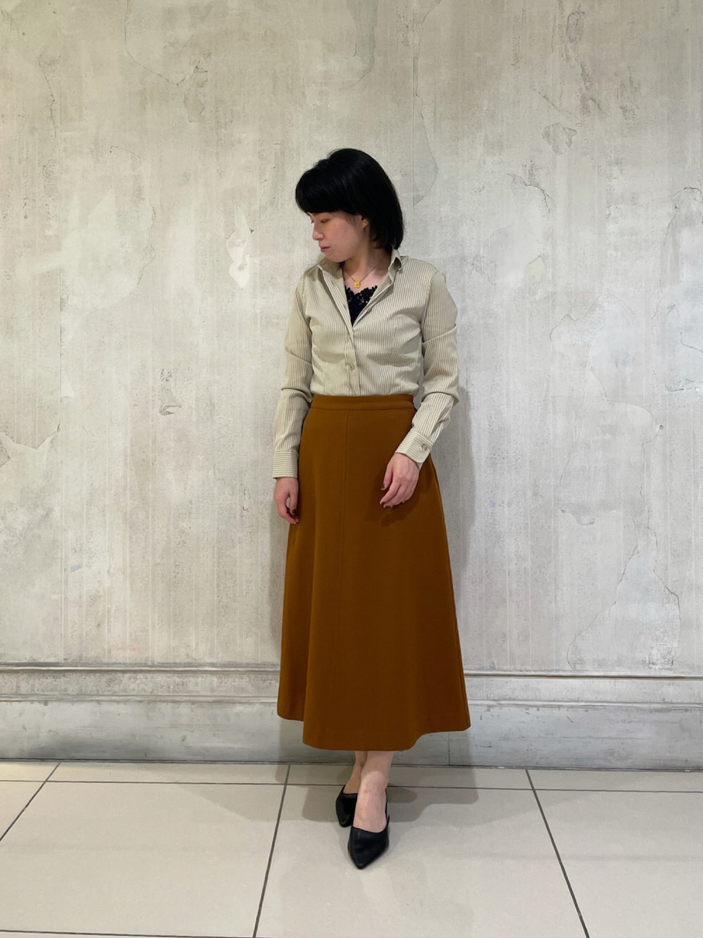 シャツ10-12-01-108 0サイズ 43カラー スカート 30-12-08-618 1サイズ 44カラー ストレッチ素材のストライプシャツにブラウンのスカートを合わせたコーディネート。 秋カラーでこれからの季節におすすめです。