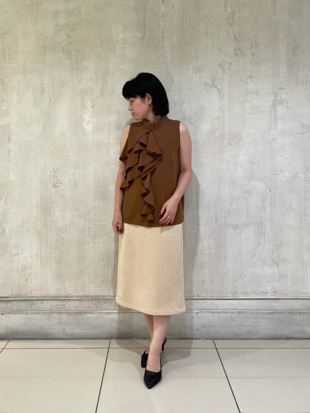 ブラウス10-12-05-607 1サイズ ブラウン スカート30-12-08-916 1サイズ ベージュ 重なり合うフリルがエレガントなノースリーブブラウスです。ノースリーブは、ジャケットやカーディガンと合わせると秋まで着ていただけます。ベージュのスエード調スカートと合わせたコーディネートがおすすめです。
