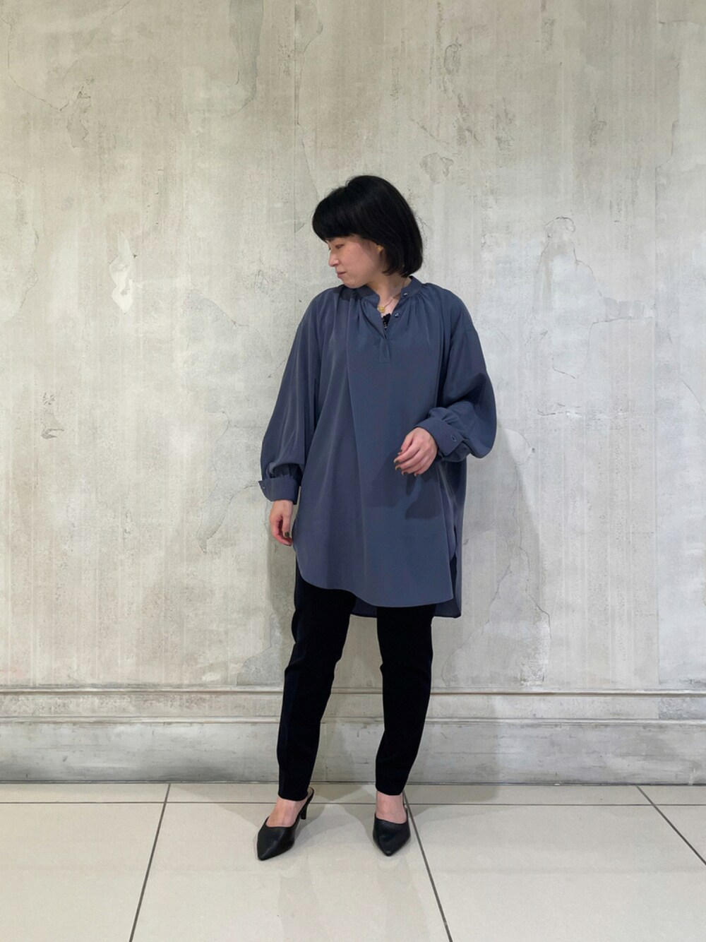 ブラウス10-12-01-018 1サイズ ブルー パンツ30-12-09-996 0サイズ ネイビー 動いた時にブラウスの揺れ感がキレイです。ドットの模様が入った生地になっております。細身のパンツと合わせたり、スカートにインして着ていただくコーディネートもおすすめです。