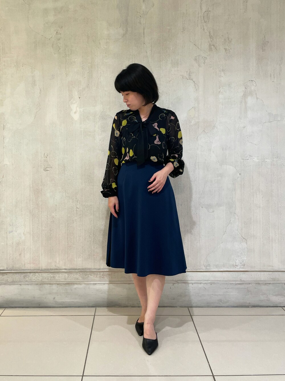ブラウス10-12-01-002 1サイズ ブラック スカート30-12-08-501 1サイズ ブルー 鮮やかなカラーが目を引くフラワープリントのボウタイブラウス。サイドプリーツのスカートと合わせて女性らしいコーディネートを意識しました。