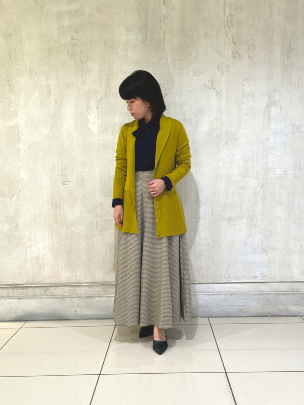 ブラウス10-12-01-010 1サイズ ネイビー カーディガン30-12-11-901 1サイズ イエロー スカート30-11-09-619 1サイズ グレー イエローのペプラムニットがコーディネートを華やかにしてくれます。 ジェガードブラウスにチェックのワイドパンツも今年おすすめの商品です。