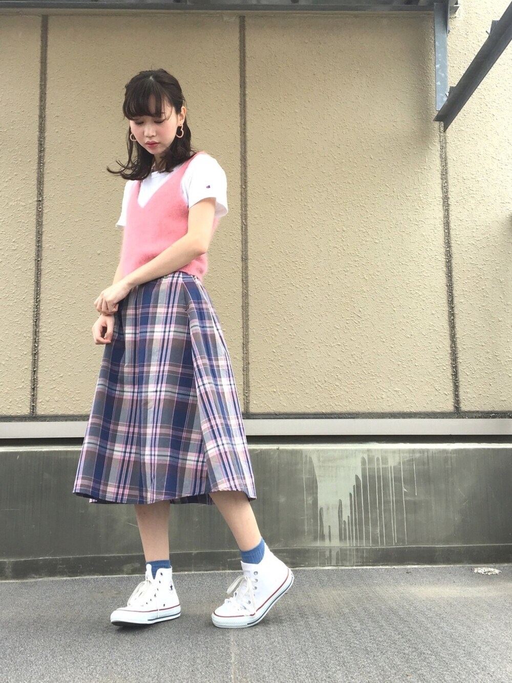 6/5 GUでたくさん買い物してきたので少しずつ着ていく。 今年はマドラスチェック?が流行りらしいね。安くなってたから買ってみた🙋♀️ ビスチェとスカートが可愛い系だから、スニーカーとTシャツで甘さを抑えてみた〜