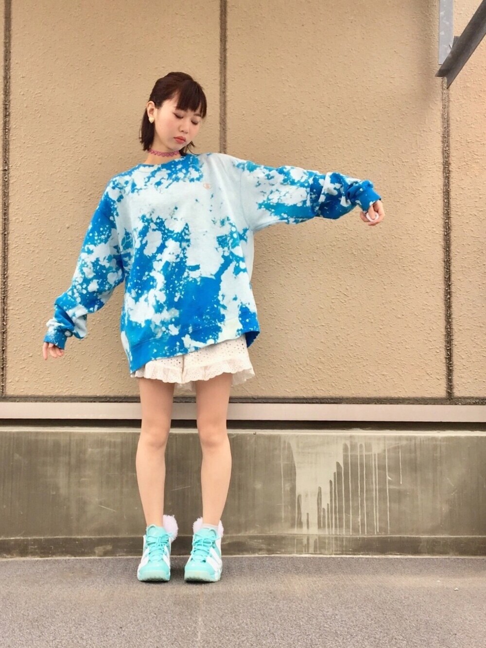 10/4 オーバーサイズでゆるゆるコーデ。パステルカラーで👏 championのスウェットはwegoで買った古着。 レースのショートパンツと合わせてみた。ワンピース風😍