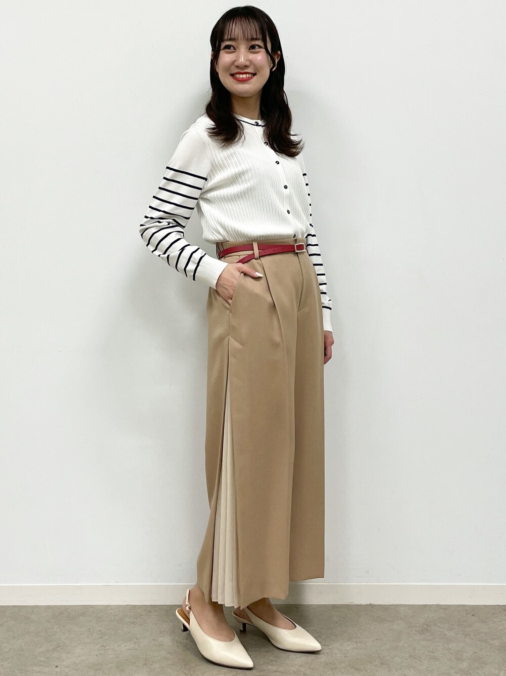 大人プレッピーなパンツスタイル♪赤のベルトで華やかなアクセントにしております! お袖のボーダー柄がプレッピーな雰囲気のカーディガンを、プルオーバーのように着用してみました。滑らかな表面でストレッチの効いたお素材なので着心地抜群です! パンツはサイドに施されたプリーツが華やかでレディな印象です。プリーツ部分は広がりすぎないのでお仕事にもお出かけにも穿いていただけます◎