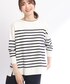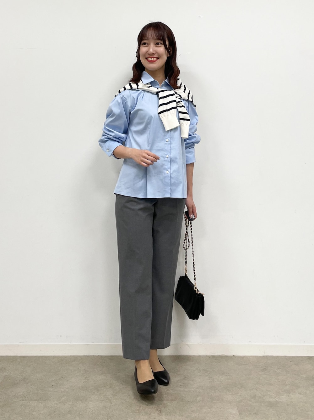 秋の爽やかパンツスタイル♪ ボーダープルオーバーを肩掛けして華やかなアクセントをプラスしました。程よくマニッシュな、こなれスタイルが完成します◎
