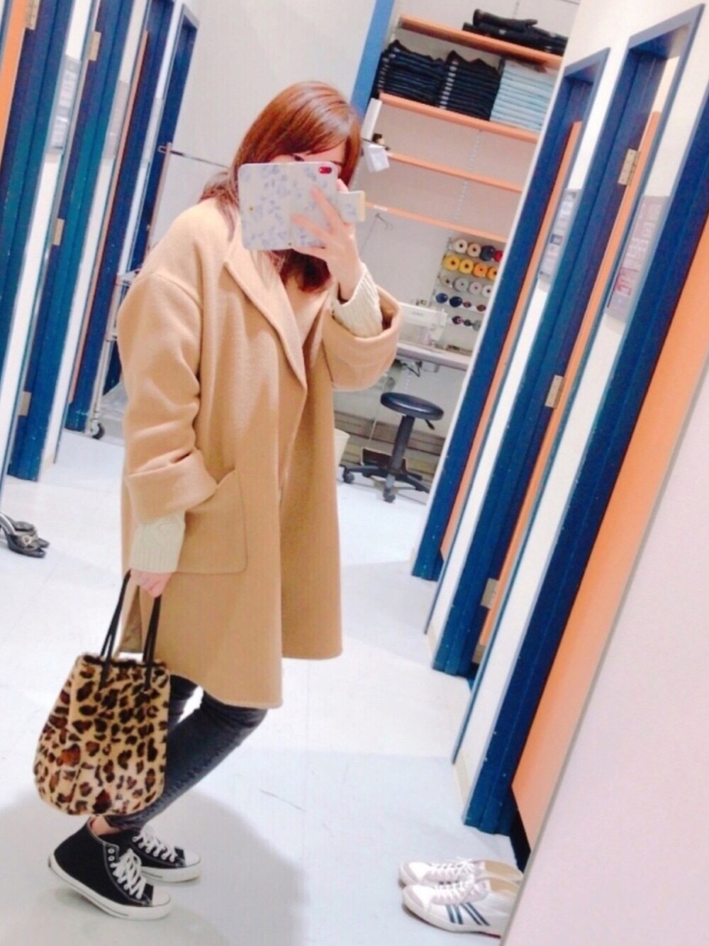 旦那さんの試着待ち中に…📸 Ungridのデニムはめっっっちゃ履きやすいけど、ピッタリしたラインなので、オーバーサイズのニットとコートでひたすら体型隠しw