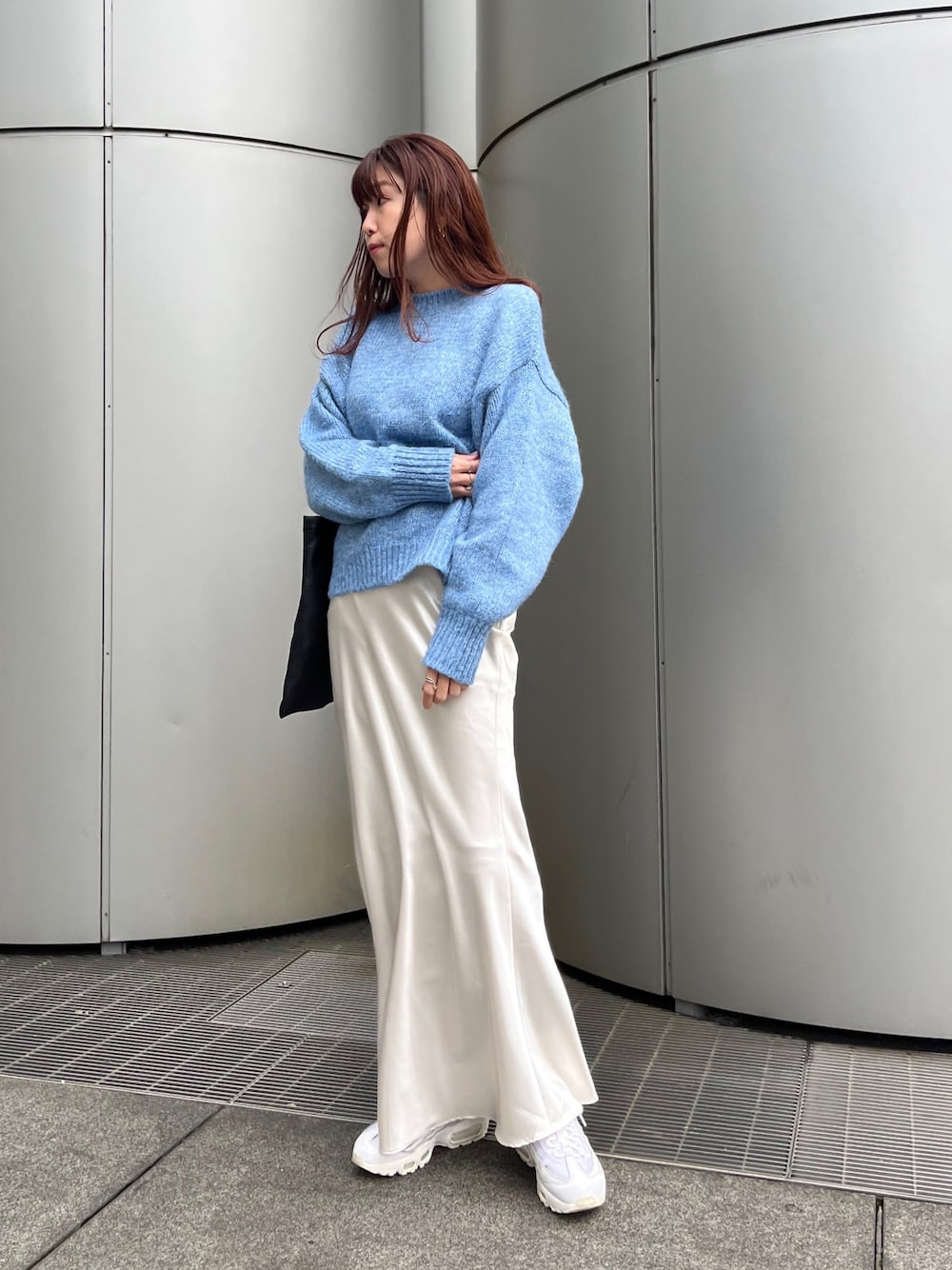 白のサテンスカートとカラーニットの組み合わせかわいい~~~🧶💙🤍
