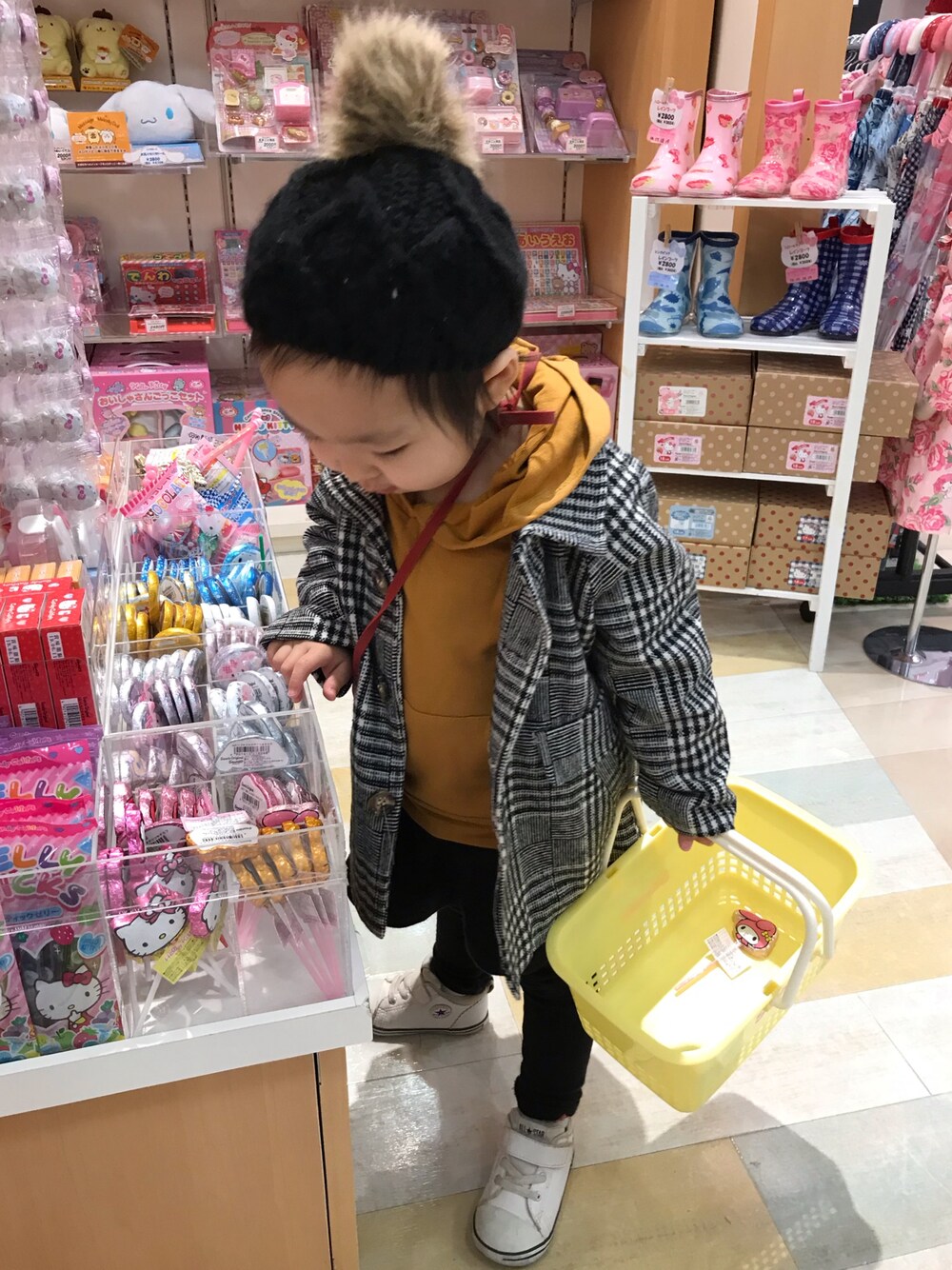 大好きなサンリオショップでお菓子を選ぶ。1つって言ったから迷ってるな♡ 外はアウター必須だけど、店内だと暑いみたいで、この後脱がれた。