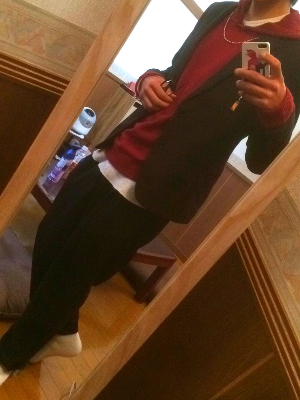たまにはこんな服装も。 ニットパーカーと GAPのサーマルのレイヤード モノトーンの中に指した赤が 心地よく映える インナーをパーカーにすることで カジュアルダウンさせました。