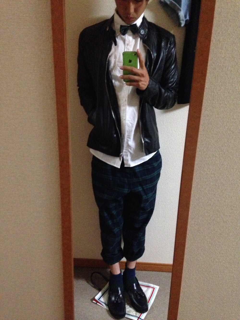 蝶ネクタイオークションでゲットしたのが今日届いたよーこで!!初めて買った!! パンツ寝巻き なぜかレザージャケ、 組み合わせが異色すぎる、、 どうだかなー、、 とりま、蝶ネクタイいい感じだ!!!