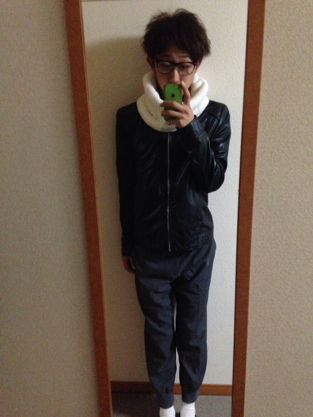 スヌードこで、、 シンプルに、、レザー全部締めました、、 さむげたんです、、