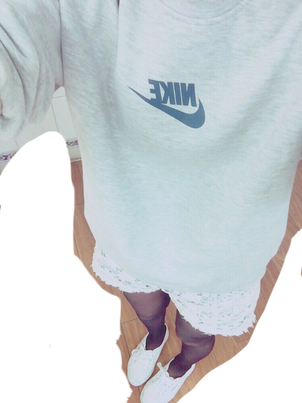 お休みの日、楽チンスタイル ナイキのパーカーは ちっさいロゴが胸元にあって 可愛くってお気に入りです。 暇だから カラオケでも行こうかな〜♪