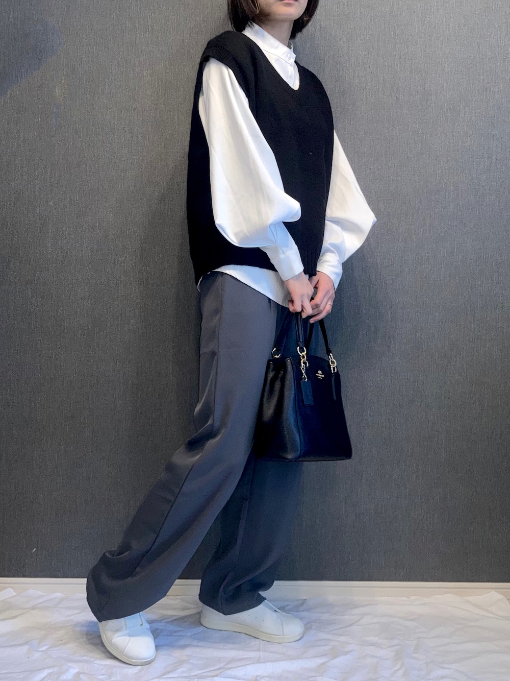 . . Qoo10で買った韓国服で プチプラコーデ☺︎🤍 . ボリューム袖シャツと、 ニットベストでシンプルに。 .