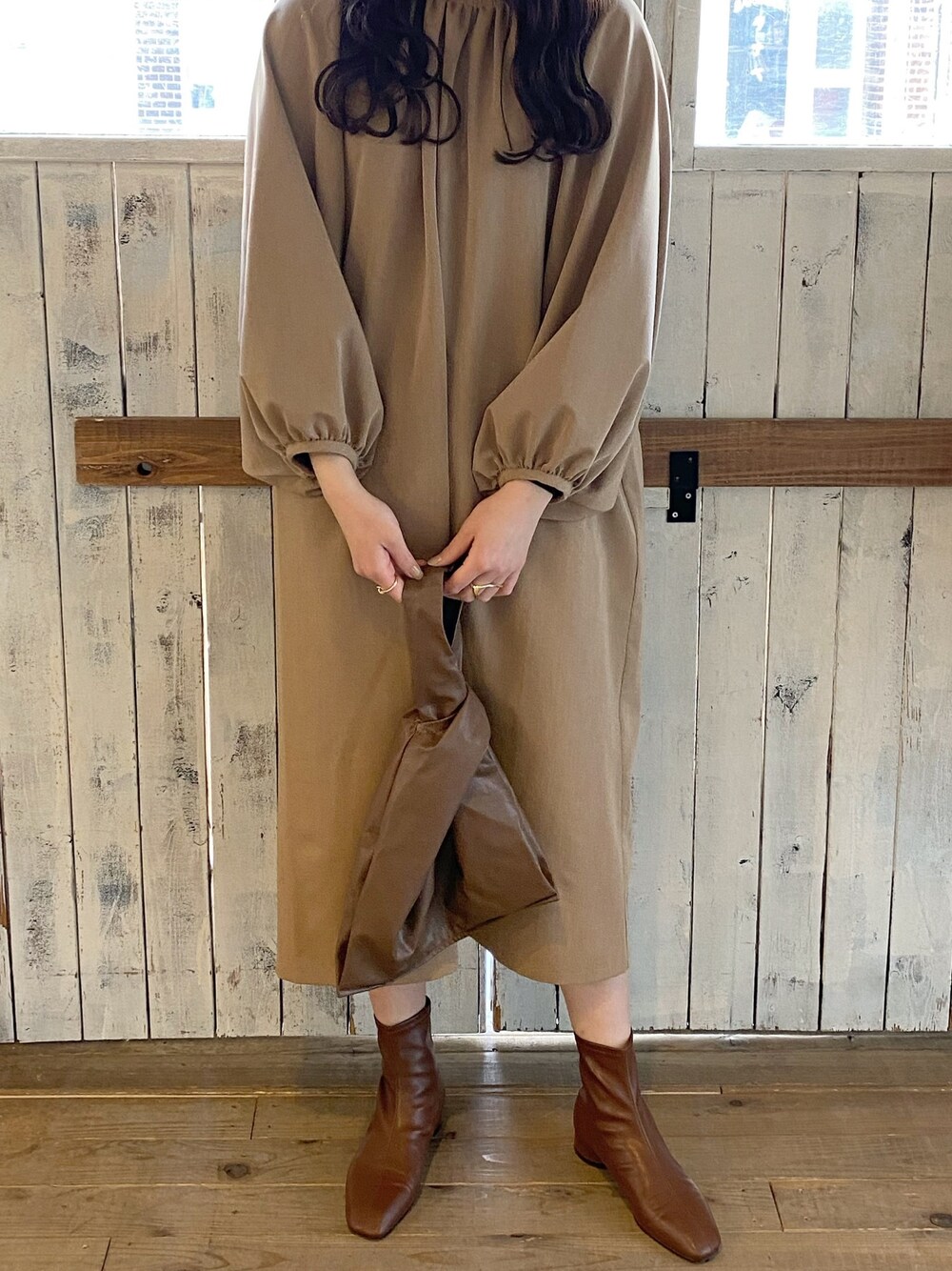 ベージュ系のワンピース/ドレス、ブラウン系のトートバッグ、ブラウン系のブーツを着用したレディースの冬コーディネートの1枚目の写真