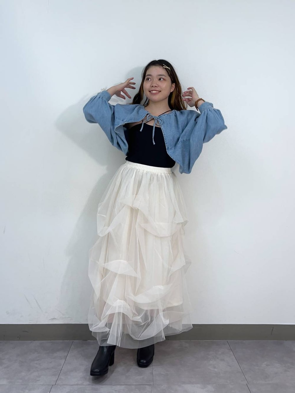 カジュアルガーリーコーデ🎀🤍 ふわふわスカートは女の子レベル100❕❕ トップスはデニムのボレロで前リボンにする事で可愛さを残しながらもちょっとだけカジュアルに🌿程よいバランスを取ってくれます。 ここで大注目!!!! ボレロが後ろは肩周りの部分で分かれているのでとってもスタイルアップ!!!!⤴︎︎⤴︎︎ ハイウエストなボトムスと合わせるとより効果アップです ご覧いただきありがとうございます⸜🌷︎⸝ 気になるアイテムは下記でチェックしてみてください👀 Instagramフォローお待ちしております🫶 🌟店舗でお見かけした際はお気軽にお声かけくださると嬉しいです☺️