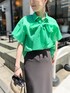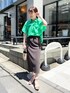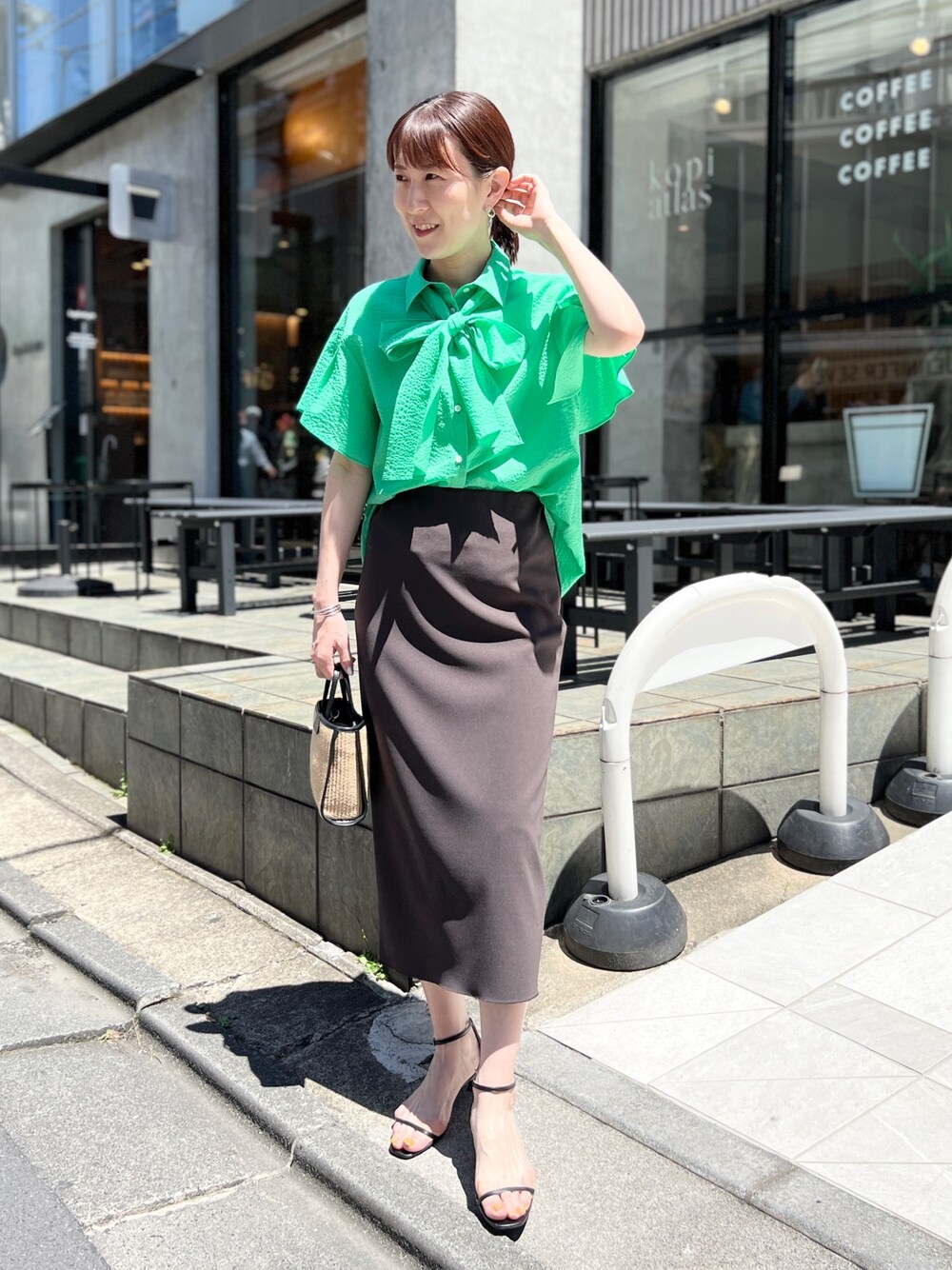 ▶︎ ラッフルリボンブラウス 肌離れのよい生地で暑くなればなるほど着たくなるブラウスです。袖はやや長めの半袖で肘の上まで隠れます。シャツ衿なので、大きめリボンの割に甘くなりすぎず爽やかな印象。アクセサリーをつけずにトップスだけで見映えさせたい時にもおすすめです。 透け感:白は少しあり 光沢感:なし 素材感、厚さ:普通 素材の機能 : 完全耐久シワ加工 お手入れ : 手洗い可能 ▶︎インゴムジャージタイトスカート 定番人気のスカートにニュアンスのあるカラーが登場しました。ウエストは1周ゴムで伸びがよく、洗ったあとにシワが残りにくい素材です。身長163cmでふくらはぎ丈のベーシックな万能デザイン。裏側がつるっとしていて肌触りがとても良いです。後ろ裾中央に約23cmのスリットあり。 透け感:なし 裏地:なし 伸縮性:あり 光沢感:少しあり 素材感、厚さ:普通 お手入れ : 手洗い可能