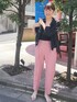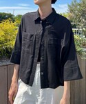▶︎クロップドシャツ フリーサイズ。レーヨンのつるっとした生地ですが麻が少し入っていて涼やかさもあります。絶妙な袖丈で腕を下ろすとひじが隠れて冷房避けにもなり、折り返して短く着ても軽やかです。ちょっとシワっぽい加工なのでノーアイロンでも自然です。 透け感:少しあり 素材感、厚さ:軽い お手入れ : 手洗い可能 ▶︎ ジュピターインゴムテーパードパンツ ※36サイズ着用。太もも周りはだいぶ余裕があり、ウエストはゴムですがゆるすぎない履き心地。タック入りで動きがでるのでお尻や足のラインを気にせず着られます。 透け感:なし 裏地:なし 伸縮性:あり 素材感、厚さ:薄手 ポケット : あり お手入れ : 手洗い可能