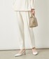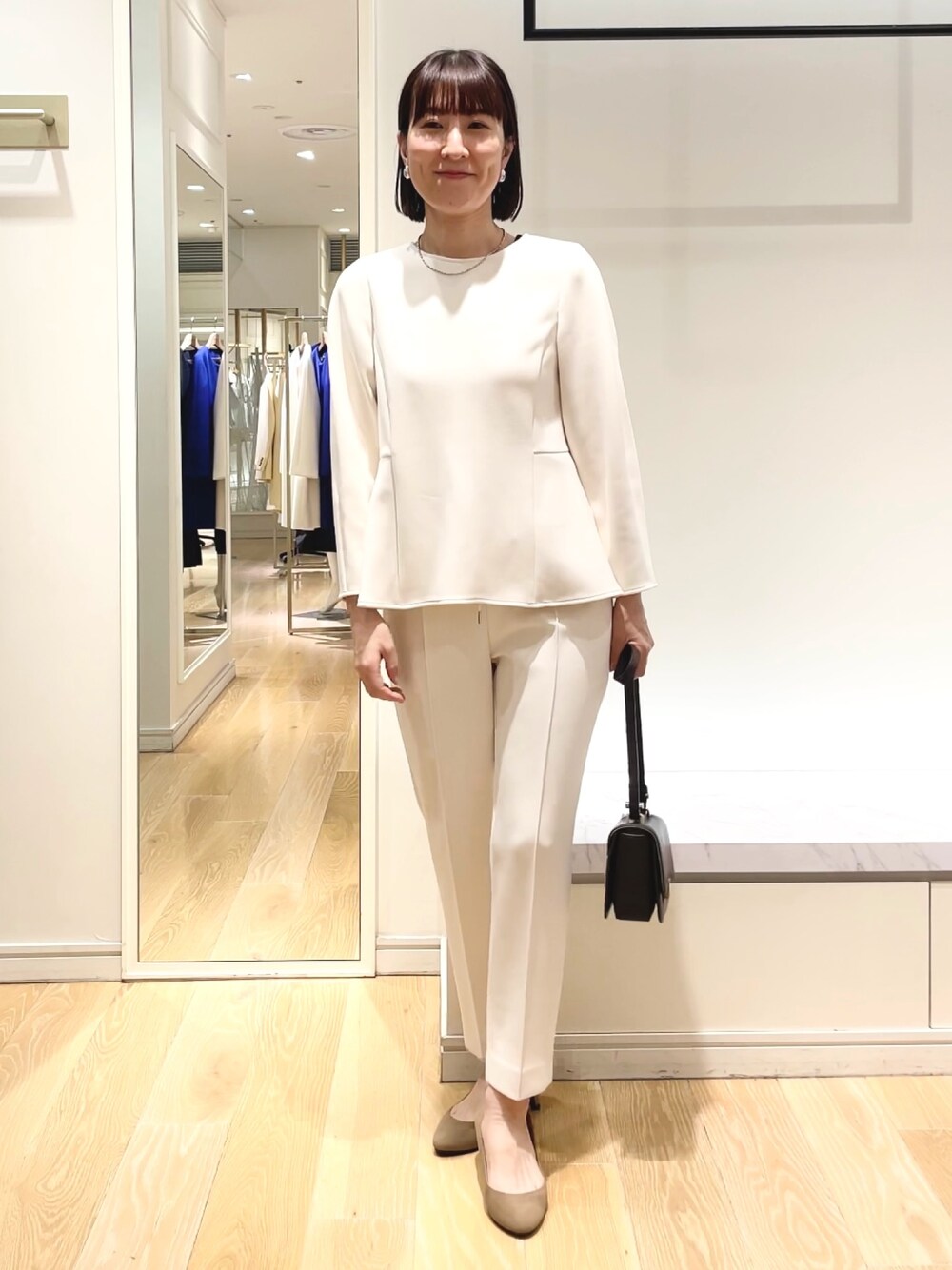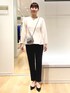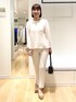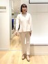 程よく肉厚なダンボール素材のセットアップ。 上下共に38サイズ着用しています。 トップスは後ろのパールボタンが華やかで、さりげないペプラムシルエットになっています。 白でも透けにくく安心感あり。(中に黒のインナーを着ていますが目立ちませんでした) パンツも裏地なしなのに透けやラインが目立たなかったです。ポケットあり。センターシームもすっきり見えるポイントです。