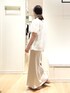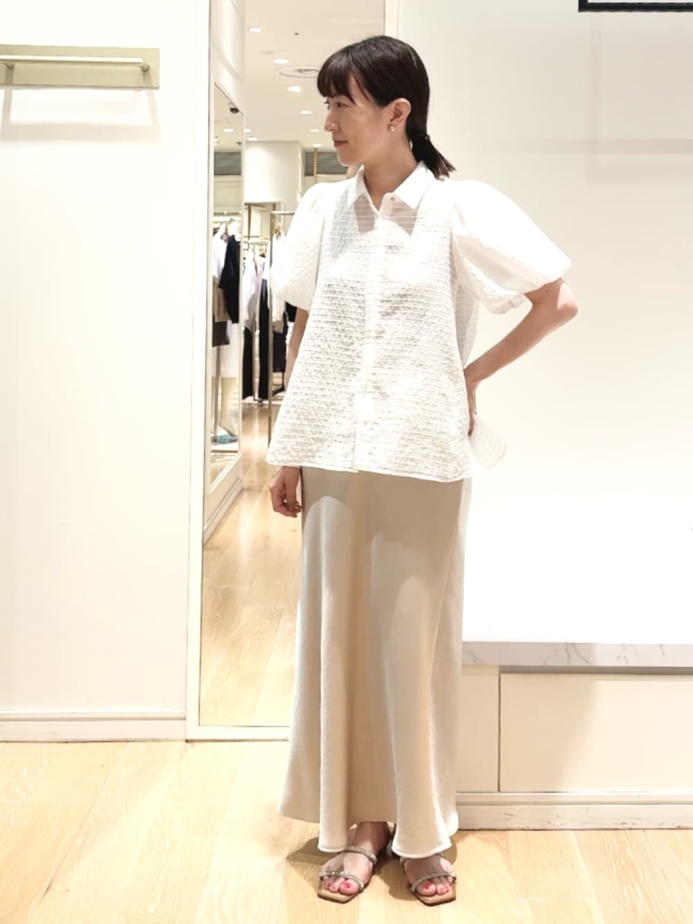 淡色コーデ💕 袖ボリュームが可愛いシャツ 前を開けると羽織ものとしても使えます 程よい透け感で爽やかな着こなしに。 袖が肩のやや内側から切り替わっているため、横に肩幅が出過ぎず ボリュームがあるのに収まりがよいです😊 38サイズ着用 フェミニンなサテンナロースカート ツヤやかで裾の揺れ感も素敵です。 スカート38サイズ着用です。 ヒップラインが気になる方はワンサイズ大きく選んでも良さそうです ぜひお試しください😊✨