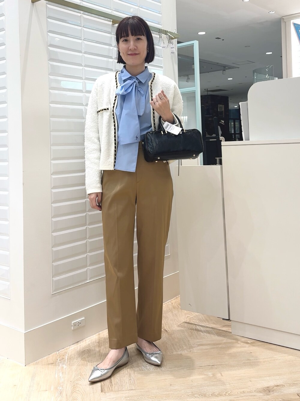 ▶︎チェーンブレードニット 華やかで温かく着られるニットジャケットです もこもこ素材で袖の筒幅がゆったりしているので 真冬まで中に重ね着可能です チェーンは前面ポケットにも付いていて、辛口スタイルにも合う ゴールドがアクセントに✨雑誌掲載もあり人気です! ▶︎ボウタイシャツ 冬スタイルが明るく見えるシャツです ボウタイの先にはNロゴの刺繍♡ コンパクトなのでボウタイを外してシャツ羽織りとしても使えます ▶︎ ダブルサテンパンツ ツヤがきれいめ見えして、ストレッチの効いた着心地よいパンツです 細身のクロップド丈ですが、太ももにピタピタ張り付かず 少しボディーラインから離れるシルエットなので カジュアルスタイルにも着回しやすいです 身長163cmで38サイズ着用しています