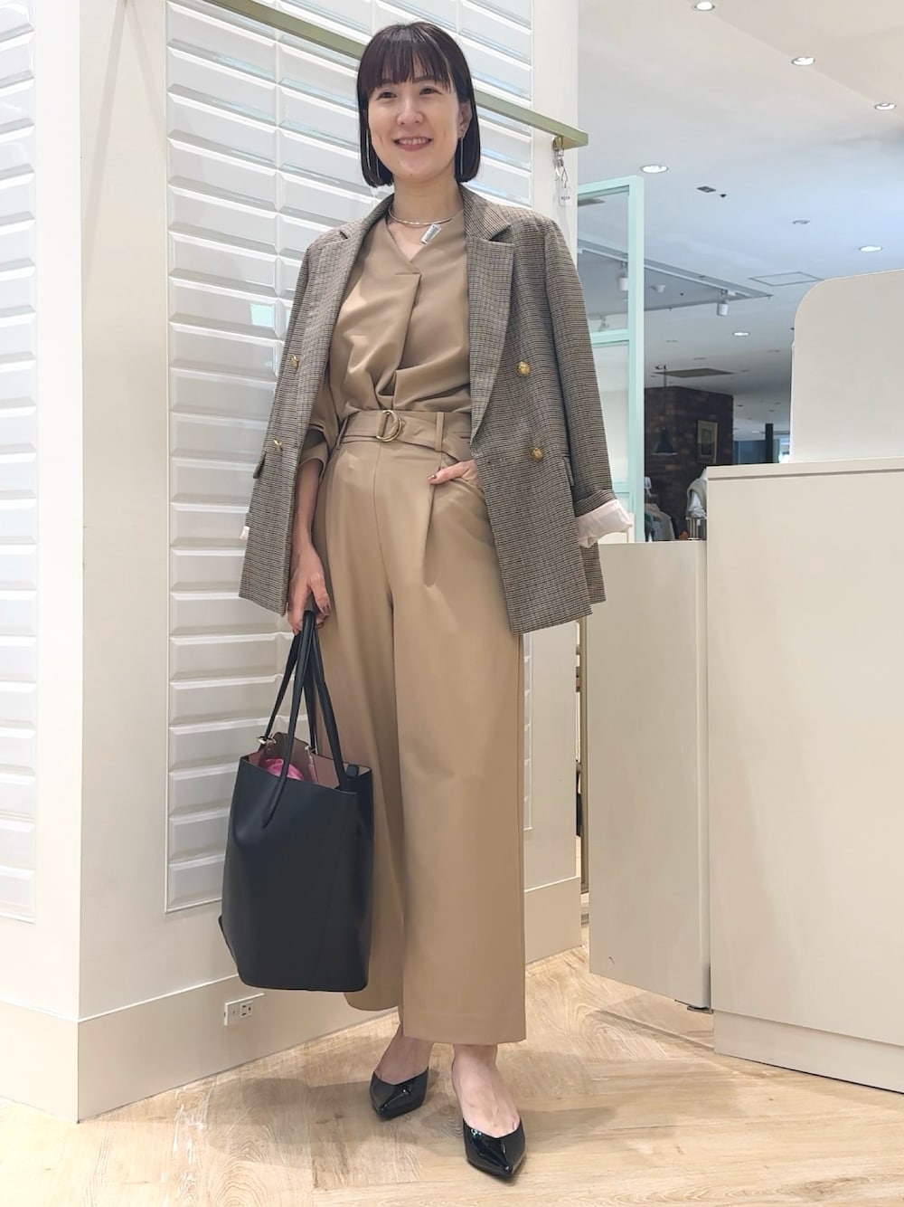 ▶︎ストレッチツイルジャケット 王道のダブルジャケット、今年はチェック柄もおすすめです! 着用の柄は細かくて遠目からだと無地見えして着回し力もあり。 柔らかくて肩周りの硬さ、肩凝る感じがないのが嬉しいポイントです。 裏地が淡いピンクで袖をまくった時にちらりと見えるのも可愛い🩷 ▶︎Vネック前タックブラウス 透けにくく、淡色でも安心感のあるブラウス。 袖口やVネック下のタックがポイントになるシンプル華ありトップスです Vネックの襟元は深すぎずに首元をすっきり見せてくれます かぶりデザインですが着脱しやすい柔らかい素材でストレスなく着ていただけます✨ ▶︎ゴールドパーツベルト付きワイドパンツ ややとろみがあり、でもテロテロしすぎない素材のワイドパンツ。 パンツ丈はやや短めなので小柄な方にも丈詰めなしで着用しやすいです 同素材のブラウスとセットで着てもきちんと感up✨ 上下で着てもパンツだけ単品使いでも着回しのきくデザインです