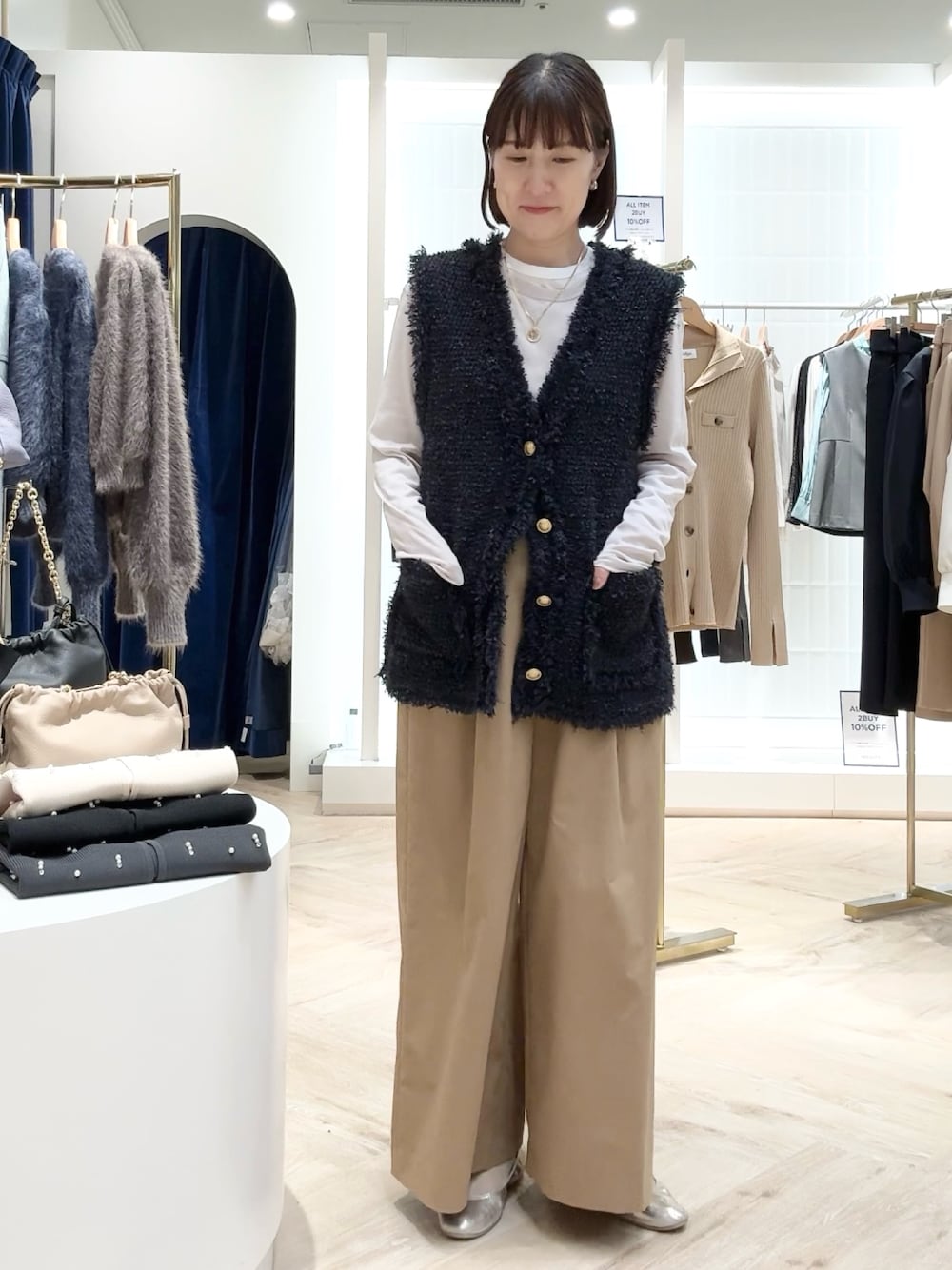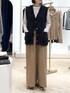 ▶︎ ツイードフリンジベスト プラスするだけで今っぽくなるフリンジのベスト。 ニットなので堅苦しく見えず、カジュアルなスタイルにも合いますし 少しツヤのある糸なのできちんとした場でも浮かずに上品なイメージ。 冬のコート下にも着ていただける程よい厚みで、ロングシーズン使えます ▶︎ウォッシャブルイージーケアツイルワイドパンツ 38サイズ着用。チノ素材ですが一般的な"チノパン"のイメージより 少し軽さがあり動きやすいです ゆったりしているので寒い時期は中にレギンスやタイツを履いてもシルエットに響かず ほぼ一年中着られます ▶︎ MY STANDARD ルーズシアーロンT ガーゼのような柔らかい綿100%ロンTです 163cmで肩幅がしっかりある骨格ですがゆったり着られます フリーサイズで柔らかな着心地。重ね着にも重宝します