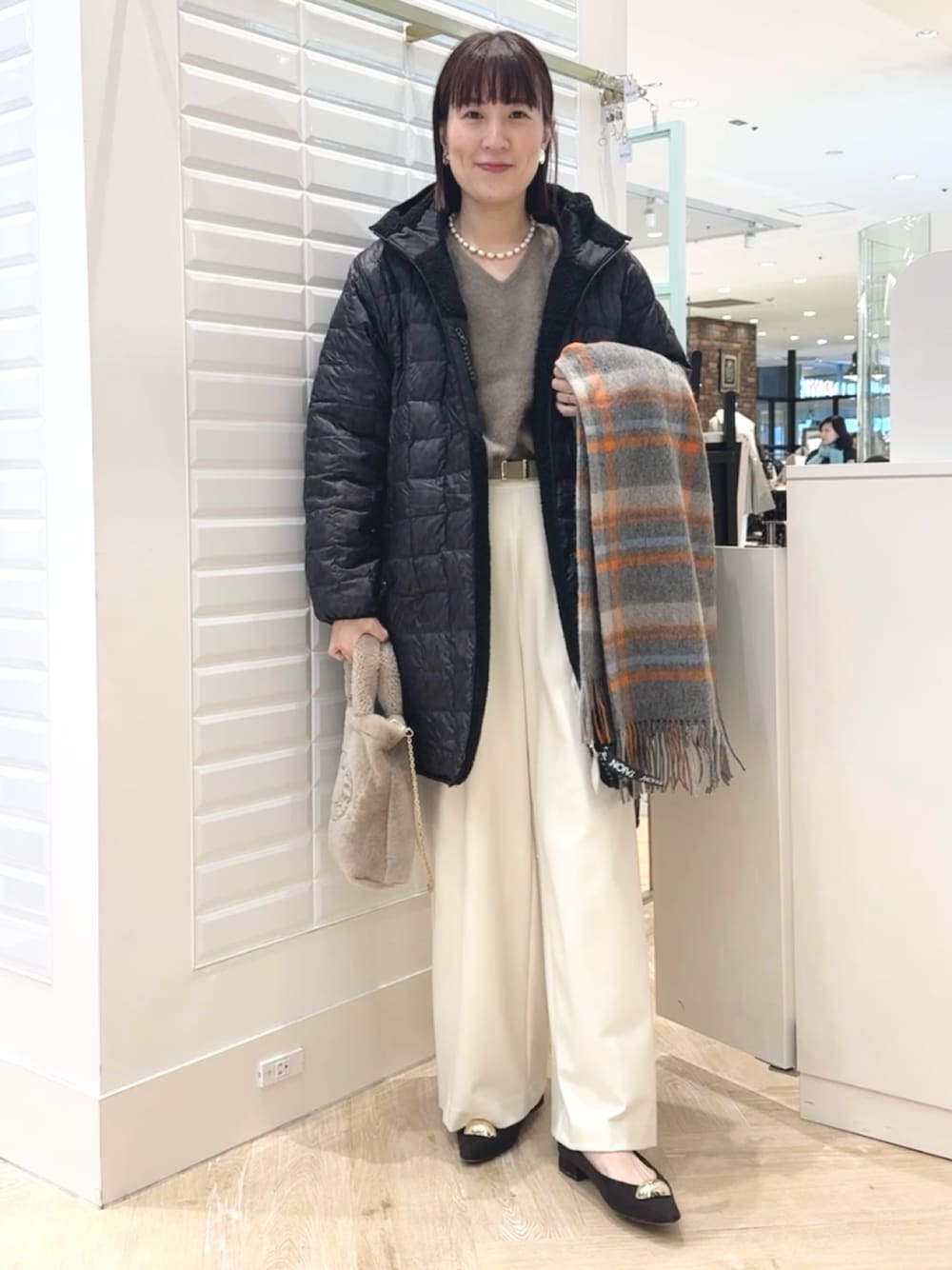▶︎ 【TAION/タイオン】 別注ボア×ダウンフードコート(リバーシブル) 毎年人気のTAIONから、今年もボアコートが登場! 柔らかなボア素材でゴワつきもなくリラックスして着られます 中はダウンなのに、モコモコしすぎないシルエット。 きれいめカジュアル派の方でも取り入れやすいです✨ ヒップがしっかりと隠れる丈なのでとても暖かいです ▶︎2ndnolleys両面起毛イージーワイドパンツ 着用しているのはストライプです!(38サイズ) 裏地なしですが裏側も起毛感があり肌に触れても温かいです 寒がりさんや寒い地域の方は、タイツやレギンスも履ける余裕あります ファスナーなど金具のないウエスト一周ゴム仕様なので 着脱も楽ですし着ていてもお腹の締め付けがきつくなく 1日中楽ちんな履き心地です ▶︎ ヘアリーVネックプルオーバーニット フォックス混でふわっふわの温かいニットです Vネックは横に開き、縦には深く無いので肌の露出も控えめ。 無理に後ろに抜いたりしなくても自然に着やすい衿ぐりです 色の出方が柔らかなので冬のきれいめあったかコーデにおすすめです