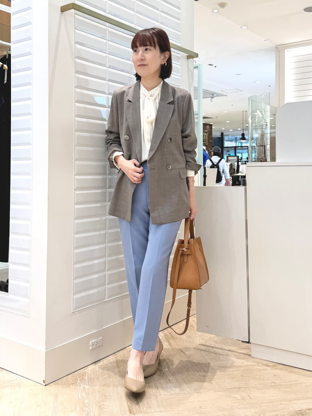 ▶︎ ダブルクロススリムパンツ 38サイズ着用。 163cmでくるぶしが見える丈です 細身ですが伸びるので履き心地が良く、 ウエスト部分がノータックで膨らまず腰回りがスリムに見えます ファスナーはウエスト左にあり、中央はノーデザイン。 ベルト通しもありオフィスでのきちんとコーデにもおすすめです! ▶︎ ジョーゼットボウタイブラウス 衿元のボウタイは取り外し可能です ジャケットインでもゴワゴワしない、通勤にもおすすめブラウス。 ジョーゼットでマットなポリエステル生地です ベーシックな雰囲気ですがUVカットや接触冷感など 高機能でオールシーズン長く使えるブラウスです ▶︎ ウォッシャブルダブルジャケット 38サイズ着用。 ウールとポリエステル半々のさらっとしたジャケットです ウール混ですがご自宅で洗濯可、裏地なしです 裏のパイピング部分の配色もポイントです。 腰下まである着丈ですが、すっきりコンパクトな印象で ビッグジャケットのようなルーズ感は出過ぎませんので オフィスコーデ、きれいめコーデにも◎ シェルの4つボタンできれいめな雰囲気ですが 上からベルトマークしたりデニムと合わせたりと カジュアルスタイルにも合います