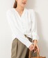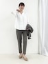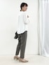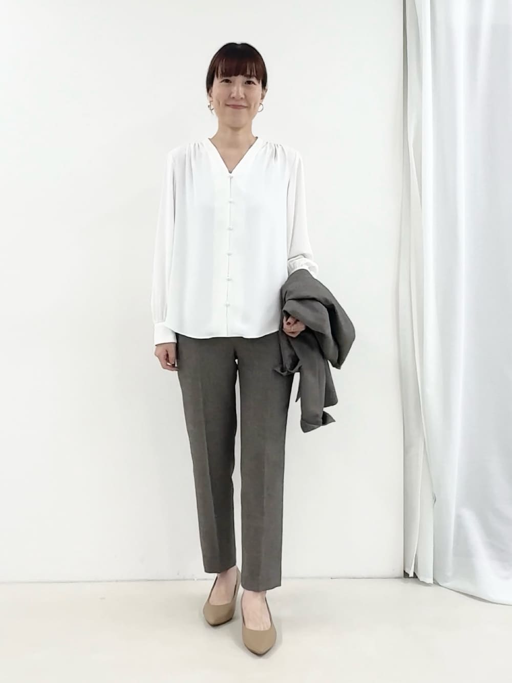 ▶︎ ウール調テーパードパンツ 38サイズ着用。 ジャケットと同素材でスーツにもなる細身パンツです 裏地付きで細身でも着替える時の滑りが良く、 きちんと見えしつつもストレッチで快適な履き心地です 163cmでくるぶしが出る位の着丈です ▶︎ ジョーゼットVネックブラウス 38サイズ着用です V開きのシャキッとした雰囲気と肩ギャザーの柔らかな印象で シンプルなのに1枚でも華のあるブラウスです ジャケットインにしてもごわつかないので 仕事中ジャケットの脱ぎ着が多い方にもおすすめです 白でも透けにくくてビジネスシーンでも安心感があります