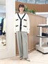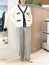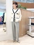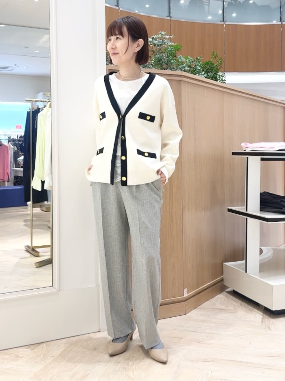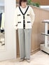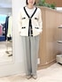 ▶︎ スムース配色Vネックカーディガン ちょっとだけ長めのVネックカーディガンです ニットジャケットのようなきちんと感を活かしてきれいめコーデはもちろん デニムやロングスカートのカジュアル服にも合う程よいゆるっと感です アームホールや二の腕部分も伸びがいいので着心地快適です もちもちっと肉感があり、見た目は春らしいのに寒々しくならずに 端境の時期に便利に着回しできます ▶︎ ウール調愛されセミワイドパンツ 38サイズ着用です 裏地あり、ご自宅で洗濯可能なロングシーズン向けパンツ。 洗濯後もセンタープレスがちゃんと残ります。 太すぎずすっきりセミワイドの着回し力バツグンシルエット。 前はタックありですがお腹周りは膨らむ感じなく、 下まですとんとまっすぐ落ちるイメージです ▶︎ 裾レース2WAYオトナサテンブラウス 持っておきたい、レイヤードにおすすめのブラウス。 裾からレースを見せる用にも使えるおしゃれアイテムです ワンサイズでややゆったり、衿も詰まりすぎず開きすぎずなちょうど良さ。 着ていて窮屈さを感じずニットやスウェット、ジャケットの中にもさらっと重ねられます お洗濯可能でノンアイロンで着られるため、ヘビロテ間違いなしです!