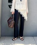 ※スウェードのバッグと青いバッグ2種類持っていますのでぜひ両方ともご覧ください😊 ▶︎ ペプラムフリル2WAYブラウス ウエスト周りのフリルが可愛いブラウスです 前後着用できますが、ボタンを前にしてシャツ風に着てみました 肩、腕周りは見た目の雰囲気よりも余裕があり、 生地も厚すぎないのでさらりと着やすかったです どの角度からでも華のある、1枚でおしゃれ完成ブラウスです😊 ▶︎ カットジョーゼットスリットパンツ 38サイズ着用 とにかく細見えパンツ! ジャージのような履き心地のとても良いパンツで、 すらっとカッコ良いシルエットなのにとてもリラックスできます 後ろ足首のスリットもポイントです