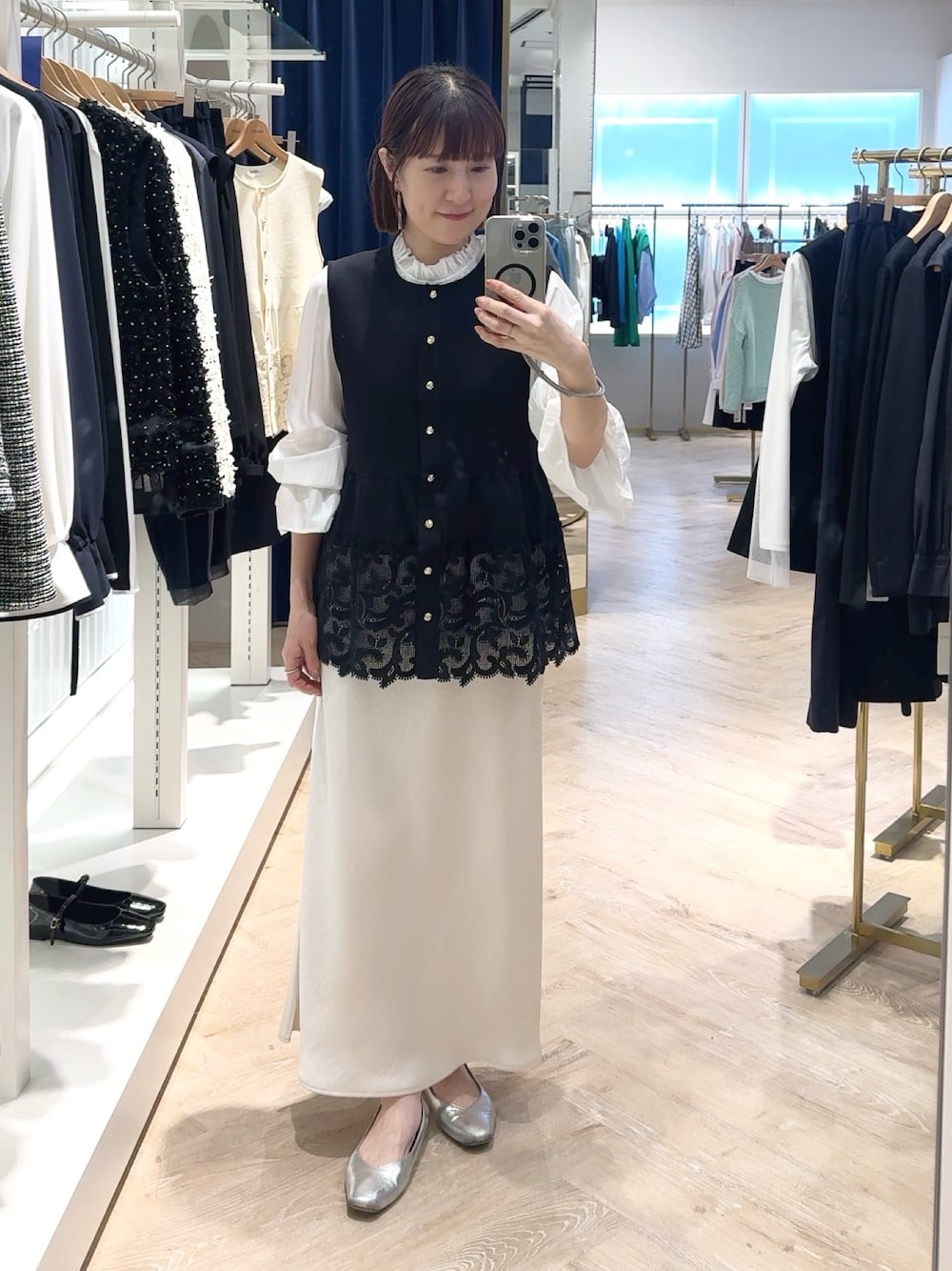 ▶︎ レース付きペプラムベスト 裾のレースの透け感が素敵なニットベストです ウエストのペプラム切り替え部分でスタイルアップして見え、 締め付けもきつくないので重ね着していても楽な着心地です フラットな表面のミラノリブでセレモニー等きちんとした場でも着ていただけます 甘め、優しい印象のレイヤードコーデがお好きな方におすすめです🪷 ▶︎ 襟フリルプルオーバーブラウス フリル衿で顔まわりが華やかになる、さらりとした落ち感ある生地のブラウスです 袖口もひらりとデザインがあるのでジレやベストとレイヤードして 袖を見せる着方も柔らかさがでて素敵です ▶︎ ウォッシャブルサテンナロースカート 38サイズ着用です ウエストゴムでファスナーなどの無いデザインです フェミニンなコーデから、カジュアルMIXもいろいろ合わせたくなる万能スカート。 裏地なしですが生地が薄くなく程よい厚みのため、 腰回りのシルエット等ボディーラインが気になりにくく どの季節でも安心して着ていただけます