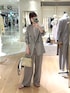 ▶︎ ドライシャーク2WAYスリットジャケット 38サイズ着用 パンツと同素材のゆったりめサイズのダブルジャケットです 袖はファスナーでスリットが作れる仕様です 私はファスナーを閉じてスリット無しで着てみました ハンサムなかっこよさもありながら、硬くない着心地良い素材で しなやかな印象もあります 通勤だけでなく社内行事やセレモニーなどフォーマル使いOK あえてロゴTシャツなどカジュアルに着るのもおしゃれです ▶︎ドライシャークタックワイドパンツ 38サイズ着用 ややゆったりめなウエスト、股下丈も充分にあり スニーカーコーデにも合います ドライタッチですが程よく肉厚なので肌寒い日でも着られます 同素材ジャケットとセットで着用していただくと ハンサムなテイストのパンツスーツになります