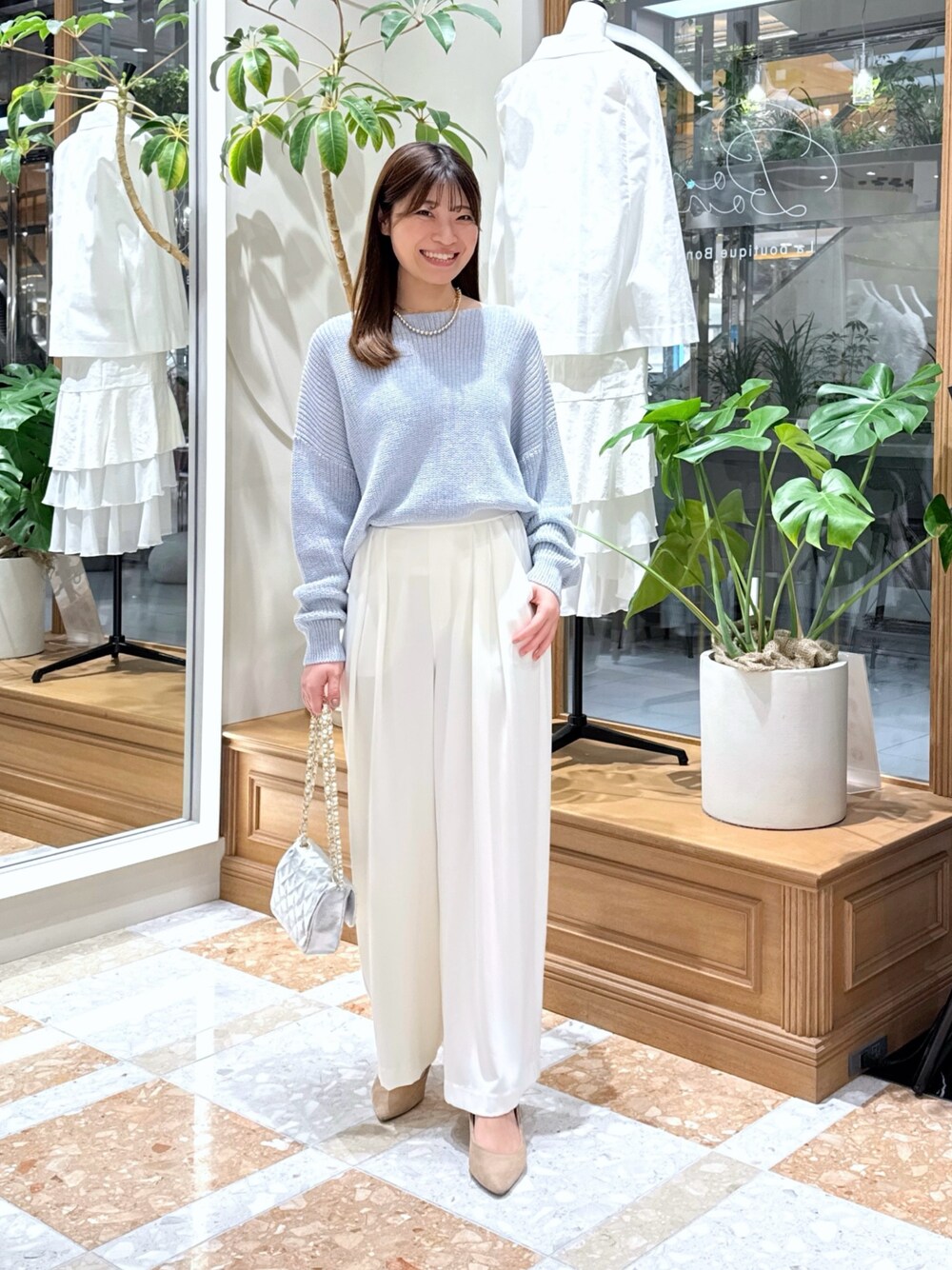 《ニット》 少しシャリ感のあるサラッとしたニット! 前後2wayでクルーかVネック、お好みで着れます^^ お洗濯可能でお手入れも簡単◎ ざっくりとした編み地ですが、透けすぎないのもポイントです♪ 《パンツ》 2タックで腰回りカバー! とても柔らかい素材なので履き心地抜群で、 軽さもポイントです^^ お洗濯可能で速乾性があるのも嬉しい◎ ウエスト周りの窮屈感はないですが、 スッキリ見せしてくれる優秀パンツです! これなら色違い購入もあり♪