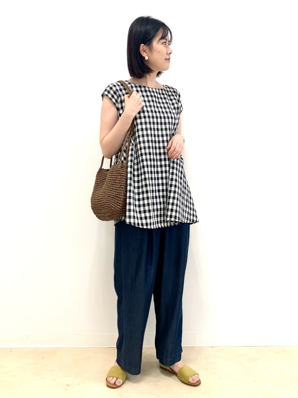チェック柄が目を惹くブラウスは フレアなシルエットが女性らしくてきれいです! デニムイージーパンツはクタっとした素材や、ウエストオールゴム仕様が履きやすく、おススメのボトムスです◎