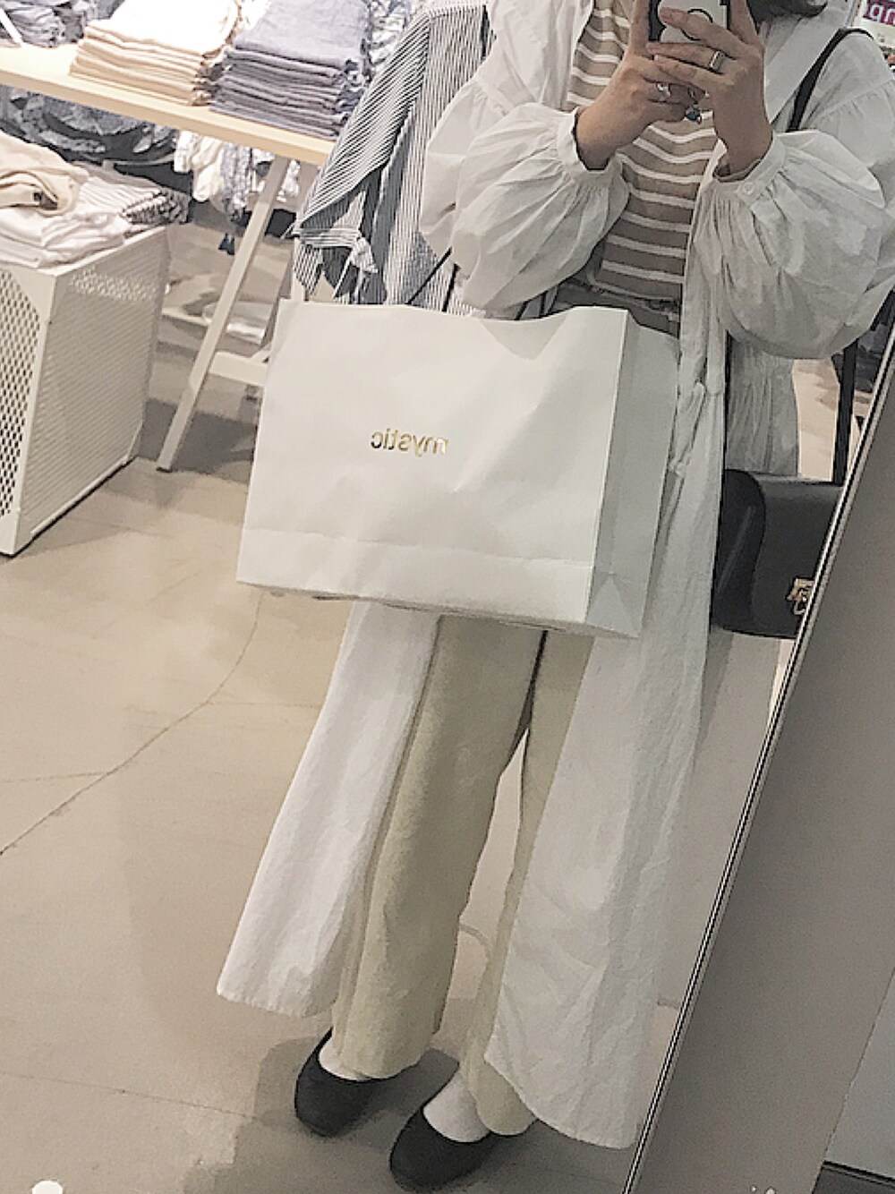 天神に行った時の🐻 ホワイトコーデにしてみた! このシャツワンピースのそでのボリューム感がたまらなく好き☺︎