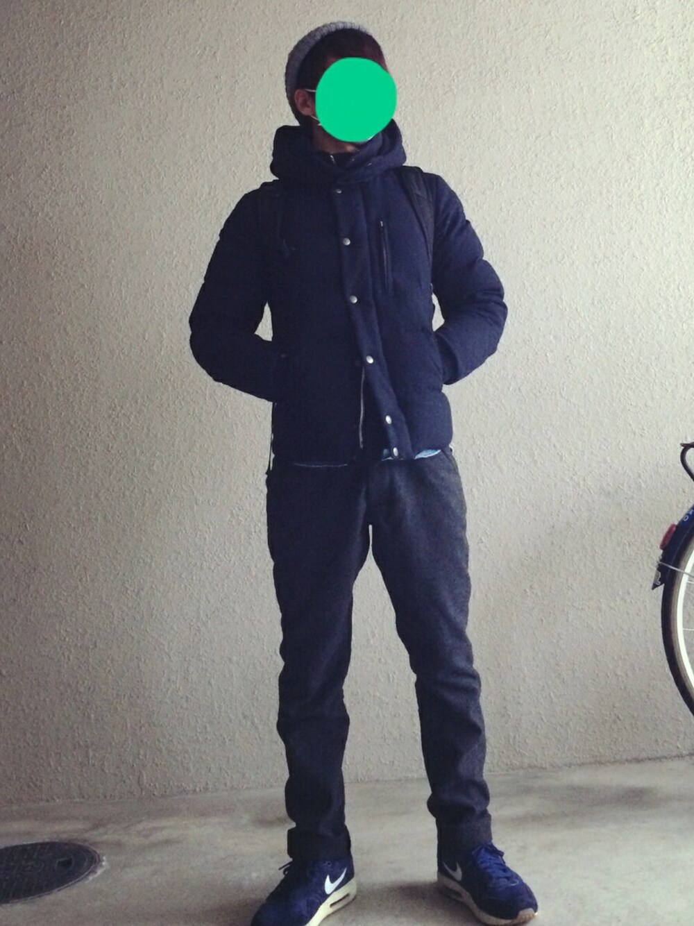 ダウンジャケット:SHIPS パンツ:BEAMS スウェットシャツ:UNIQLO シャツ:HARE ニット帽:妹から拝借 ん?このニット帽小さくない? …だれが顔デカイや!
