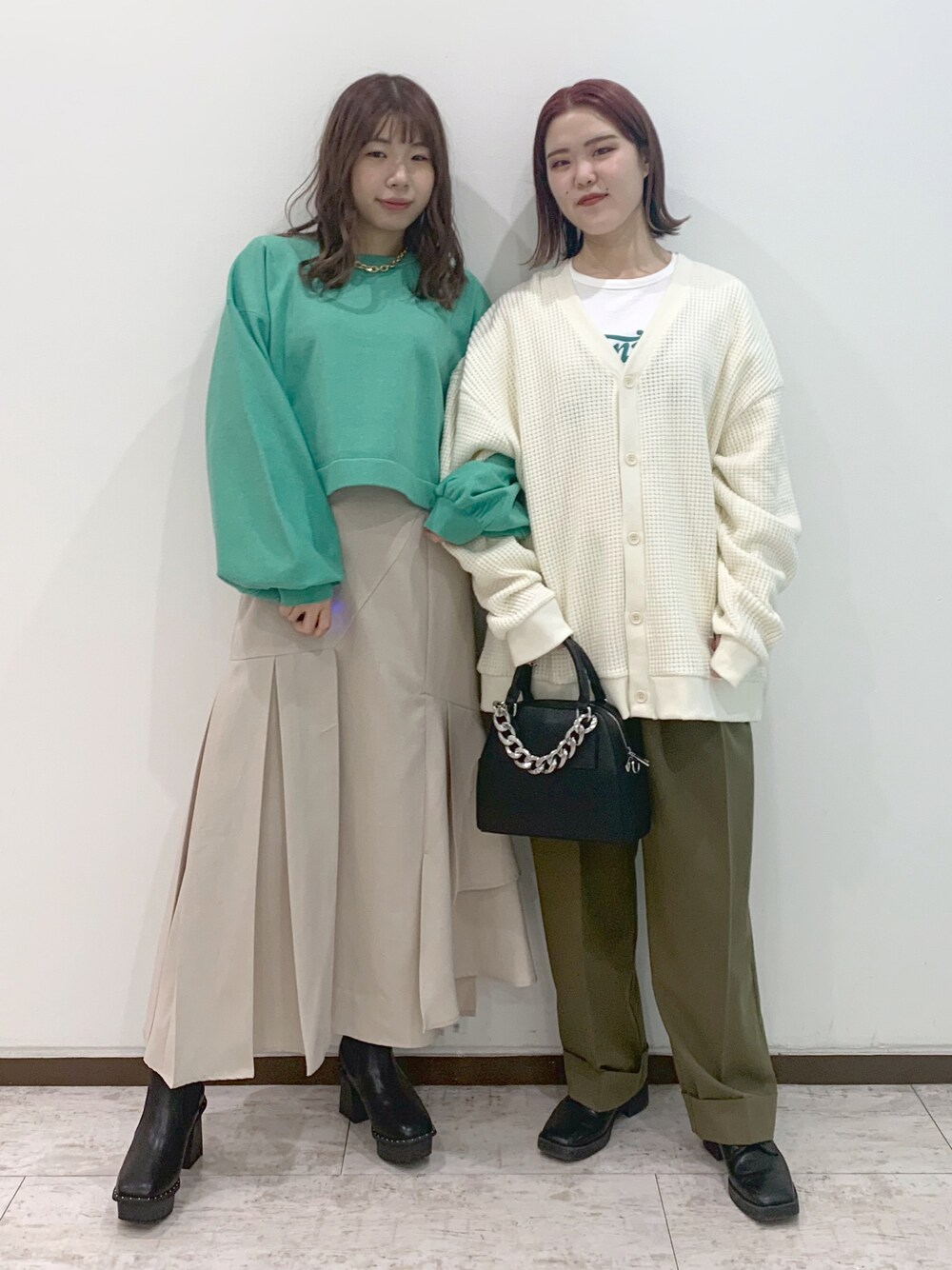 同い歳のスタッフと一緒に デート風コーデ!♡♡ ショート丈にロングスカートで、定番ながらもトレンド感のあるコーデが◎◎ 甘すぎないところが、デート以外でも使えるポイントです! メンズライクのコーデは女性でも着れるので、ラフに着たいときに最適! 是非デートの参考に、、♡♡