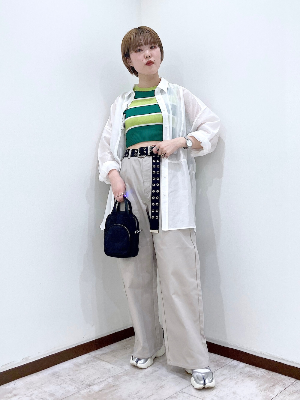 スポーティーコーデ LIMのボーイッシュなスケーターパンツに、へそ出しのノースリーブを合わせて、女性らしいスポーティーなコーデに! 全体的に明るめなカラー合わせで、春夏のさわやかさも出してみました! パンツはゆったり履けるサイズ感で、丈感も丁度いい! ハイウエストで履いて頂けるので、今回のようなへそ出しトップスと合わせても、1番くびれている部分を出せるので、スタイルアップに繋がります! ここで長めのベルトを合わせることで、よりスポーティーな雰囲気で着ていただけます! ショート丈のインナーは、カラーが鮮やかなので一気にこなれ感が増します! ピタッとするデザインなので、胸の大きさによってはもう少しお腹部分が出ることになると思います! 結構しっかり目な生地感なので、安心して着ていただけます!