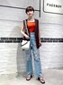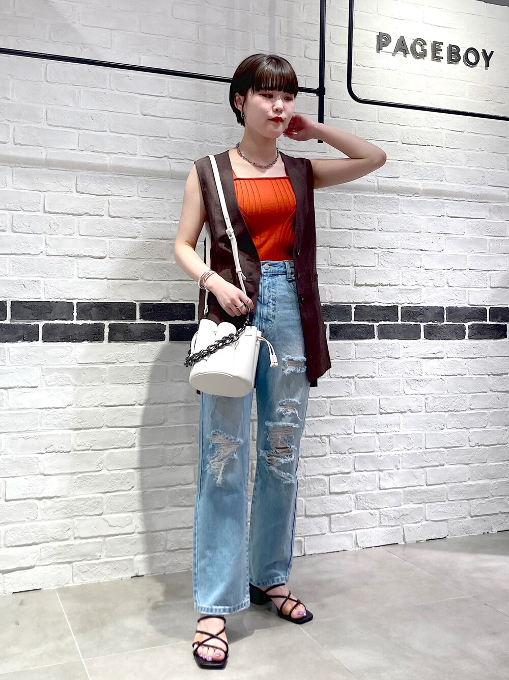 カジュアルカラーコーデ ジレ×デニムの定番合わせながらも、オレンジ×ブラウンのカラー合わせでこなれ感up!◎◎ オレンジと明るいブルーのデニムにすることで、夏らしい雰囲気に!