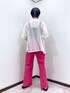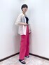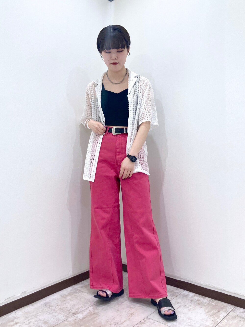 カラーコーデ 夏らしいレース開襟シャツに、ピンクのパンツでトレンド感を演出!◎◎ インナーをショート丈で合わせて、スタイルup効果抜群コーデです!