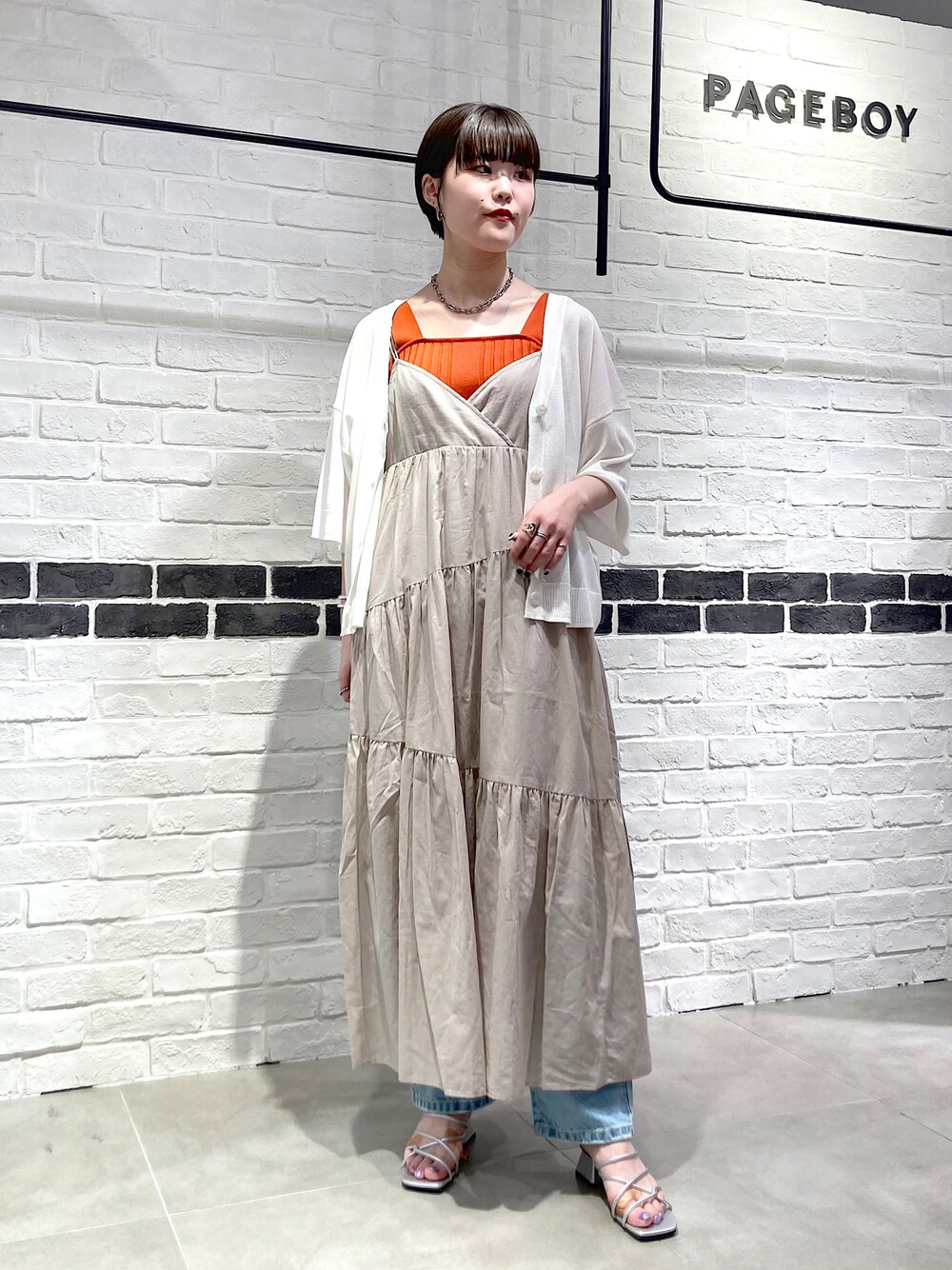 大人夏コーデ ベージュ×オレンジの夏っぽいカラー合わせで、爽やかで涼し気な印象に!◎◎ デニムインでレイヤードすることで、可愛すぎず大人っぽく着ていただけます!